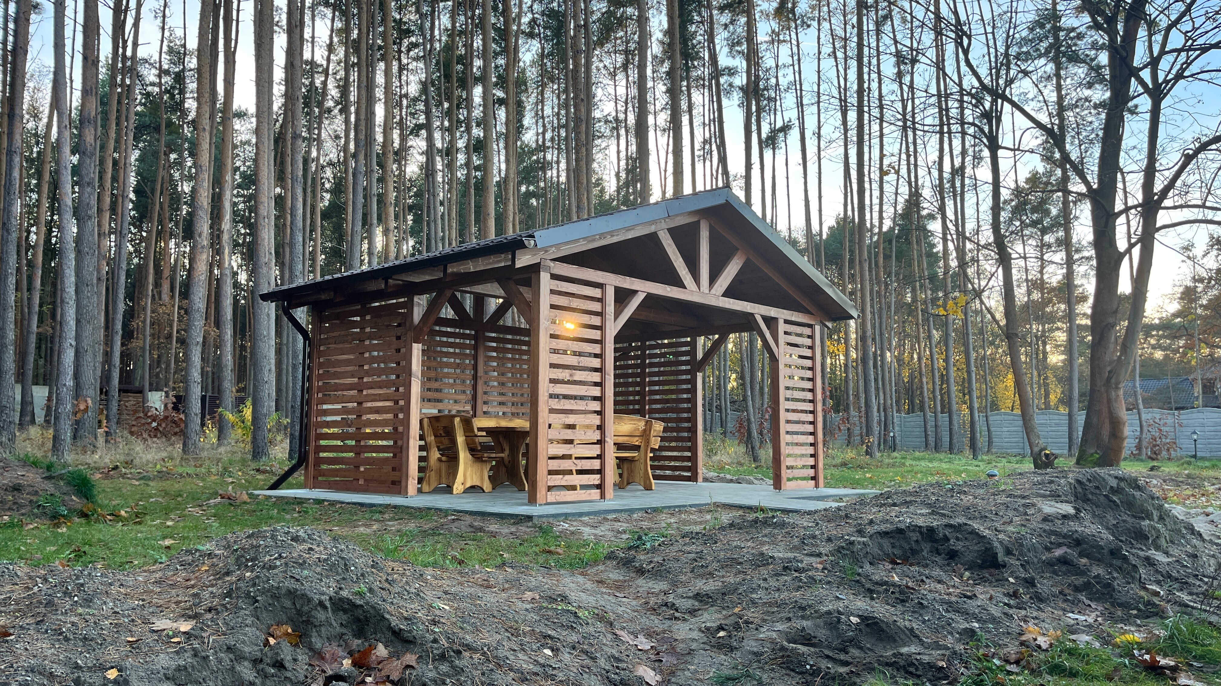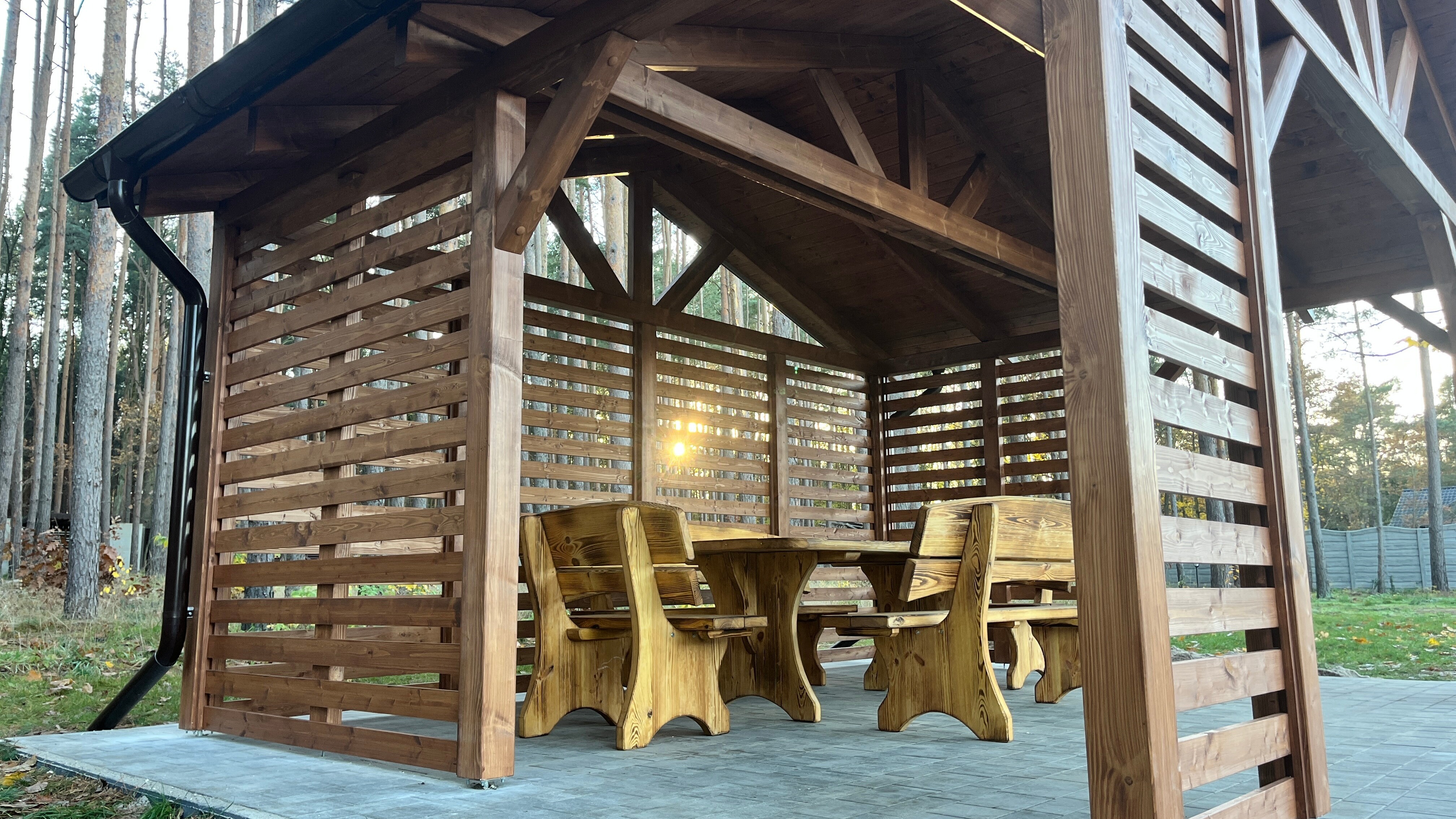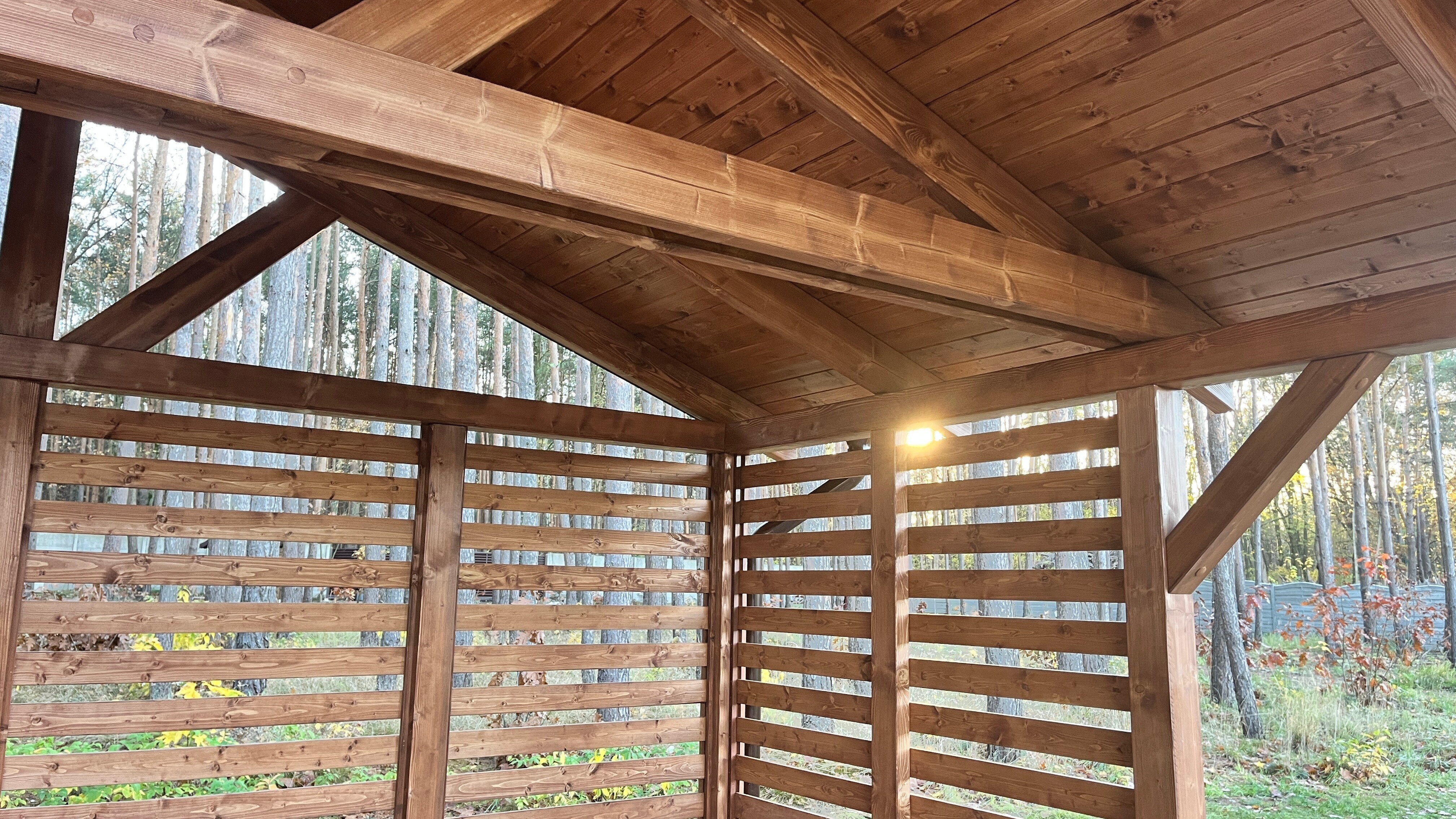 Altanka wykonana z drewna konstrukcyjnego KVH, które dzięki suszeniu komorowemu i klejeniu charakteryzuje się wysoką stabilnością wymiarową, minimalną ilością pęknięć oraz trwałością na lata. Konstrukcja została wykończona w kolorze Golden Brown z palety Flügger Wood Tex, co podkreśla naturalny rysunek drewna i nadaje całości ciepłego charakteru. Poszycie dachowe stanowi: podbitka 18mm, membrana, kontrłata, łata, blachodachówka oraz obróbka blacharska. Altana została zamocowana na ukrytych podstawach słupa typu T, co pozwoliło zachować nowoczesny i minimalistyczny wygląd bez widocznych okuć stalowych.
