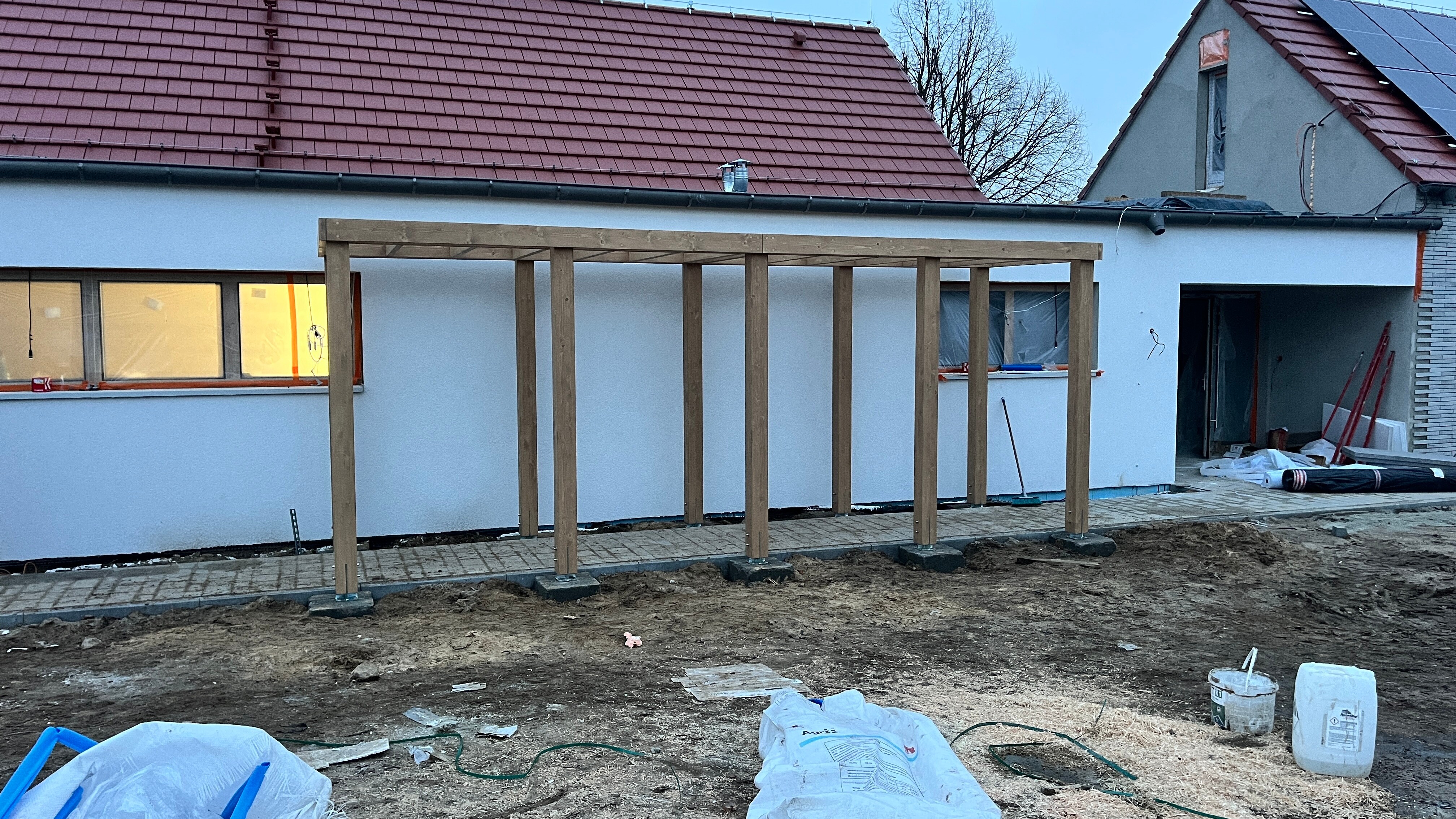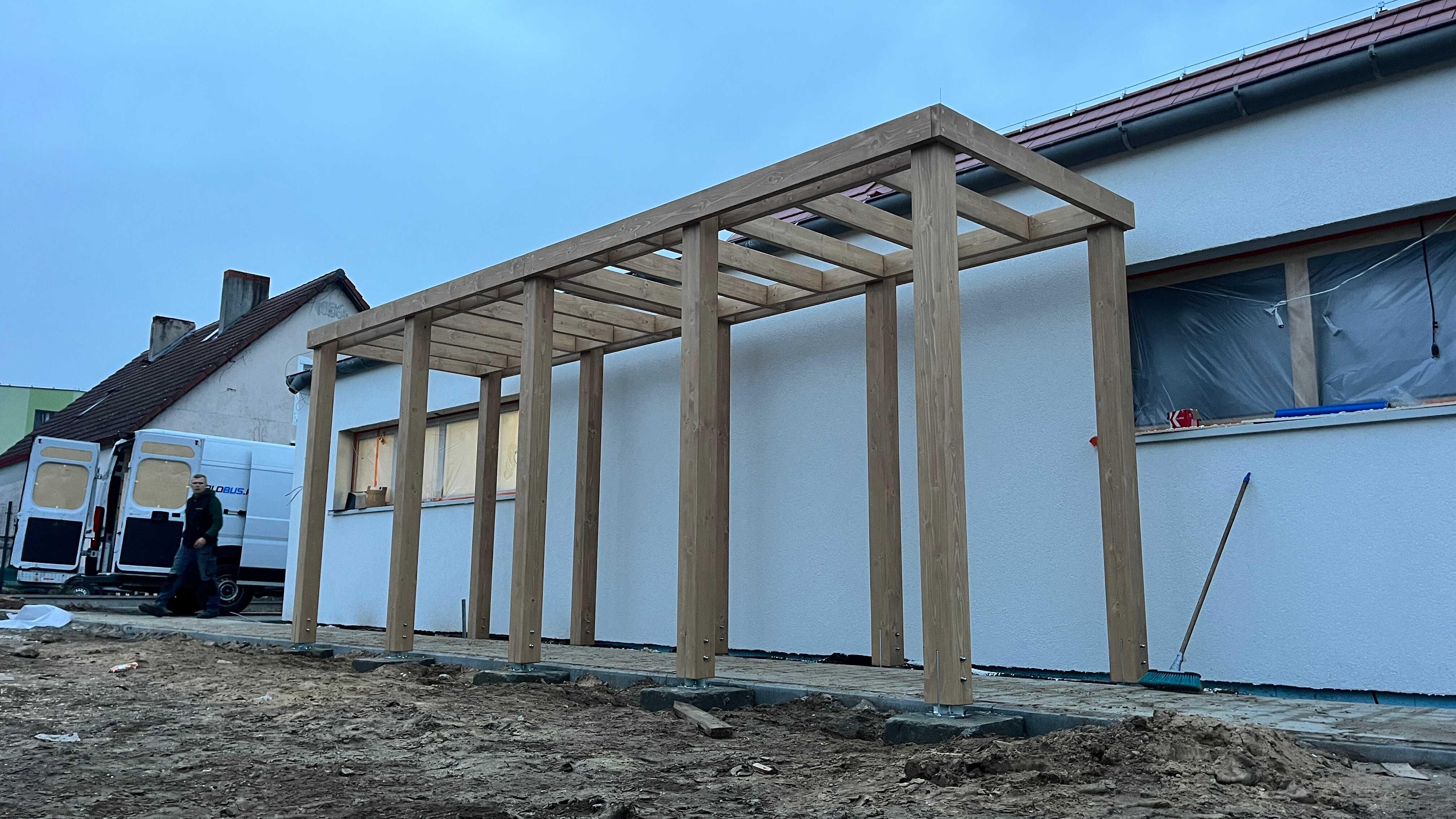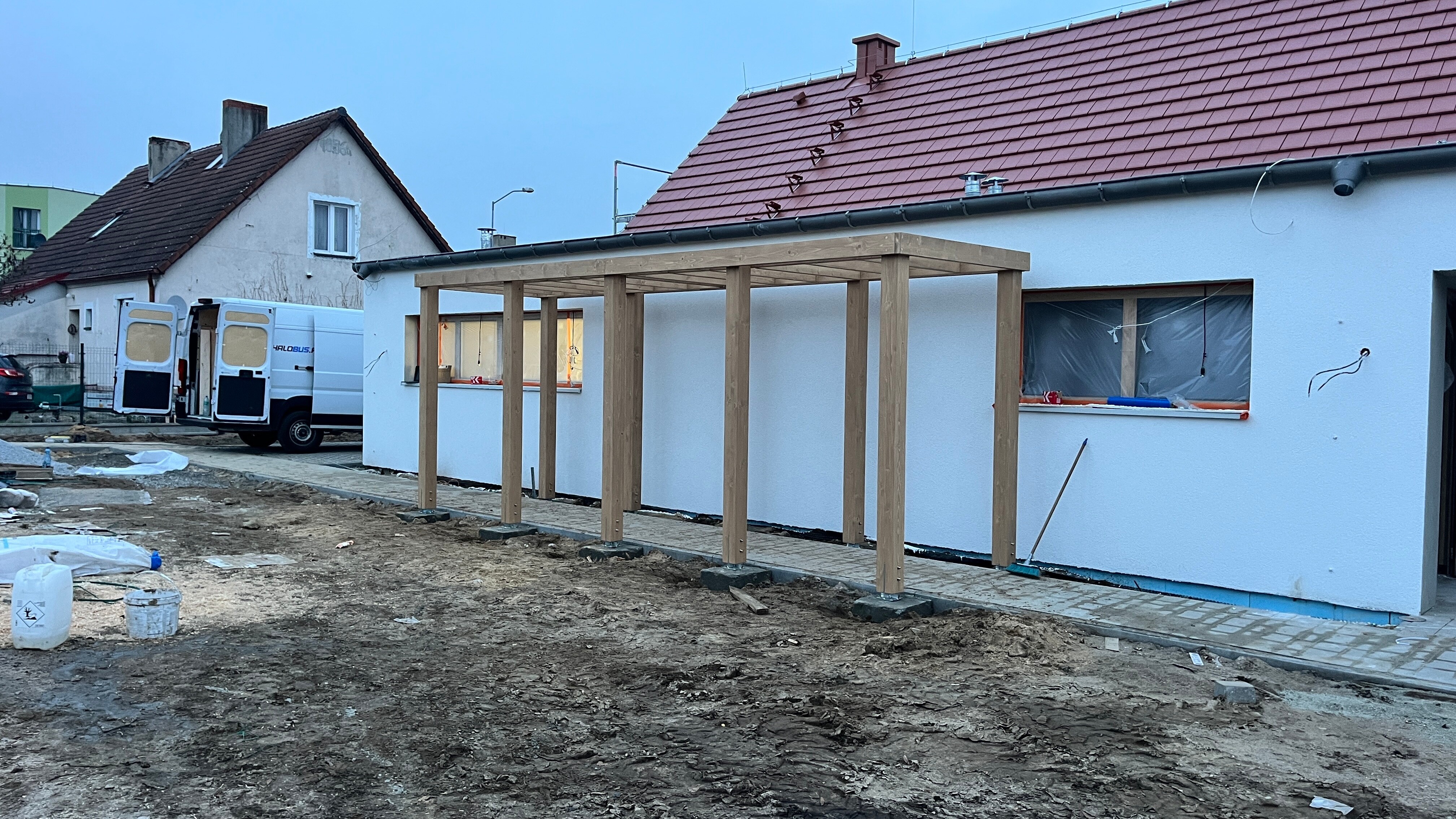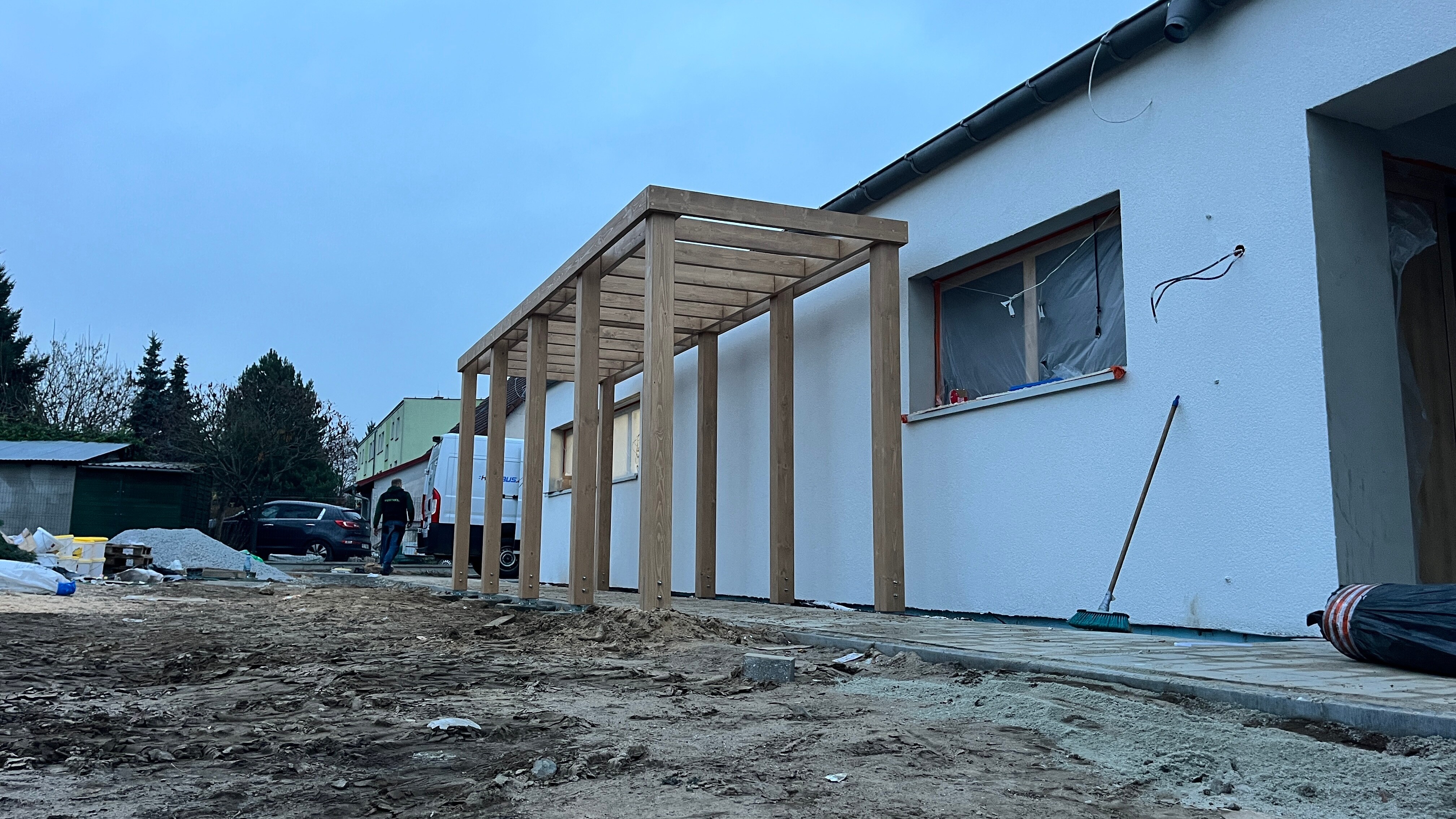 Do realizacji tego projektu użyliśmy drewna świerkowego BSH, które cechuje się wyjątkowymi właściwościami technicznymi. BSH to drewno suszone komorowo, a następnie klejone, co pozwala na redukcję naturalnych pęknięć oraz skręceń materiału, które mogą występować w tradycyjnych elementach drewnianych. Dzięki temu konstrukcja zyskuje na trwałości i estetyce, a także zachowuje swoją stabilność przez długi czas. Proces klejenia zwiększa również odporność na odkształcenia, co sprawia, że materiał ten jest idealny do budowy konstrukcji wymagających precyzji i wysokiej jakości wykończenia.