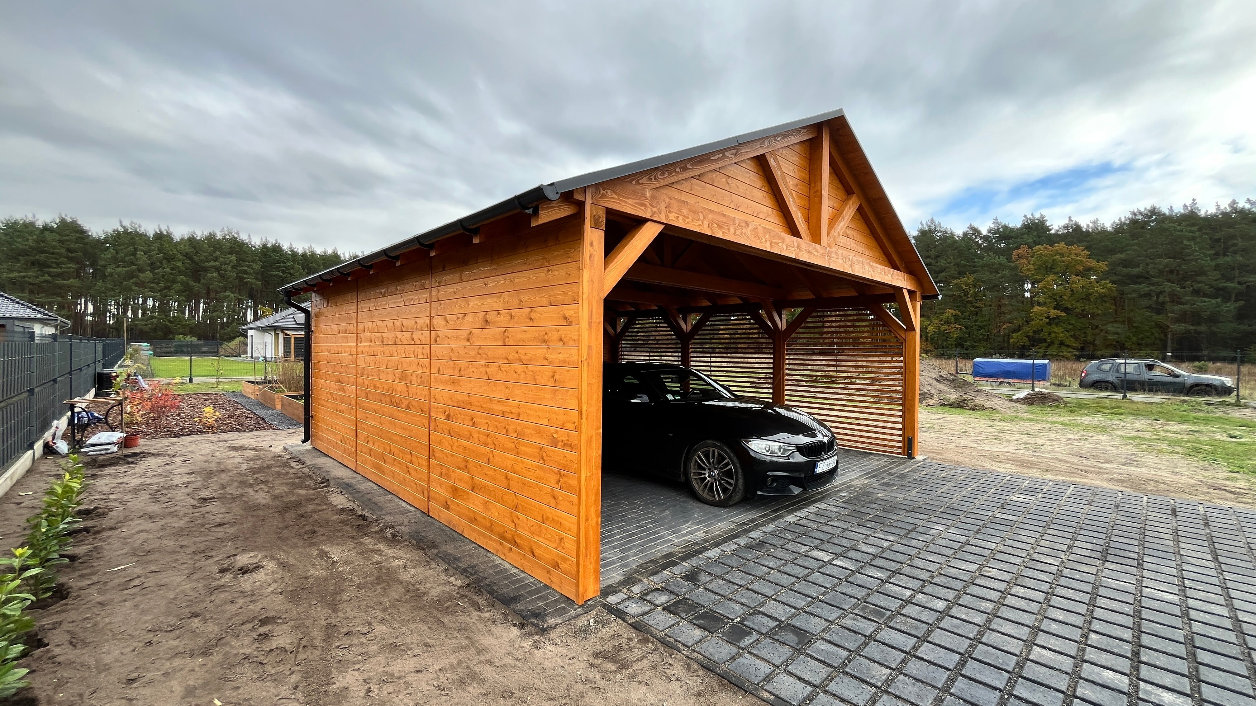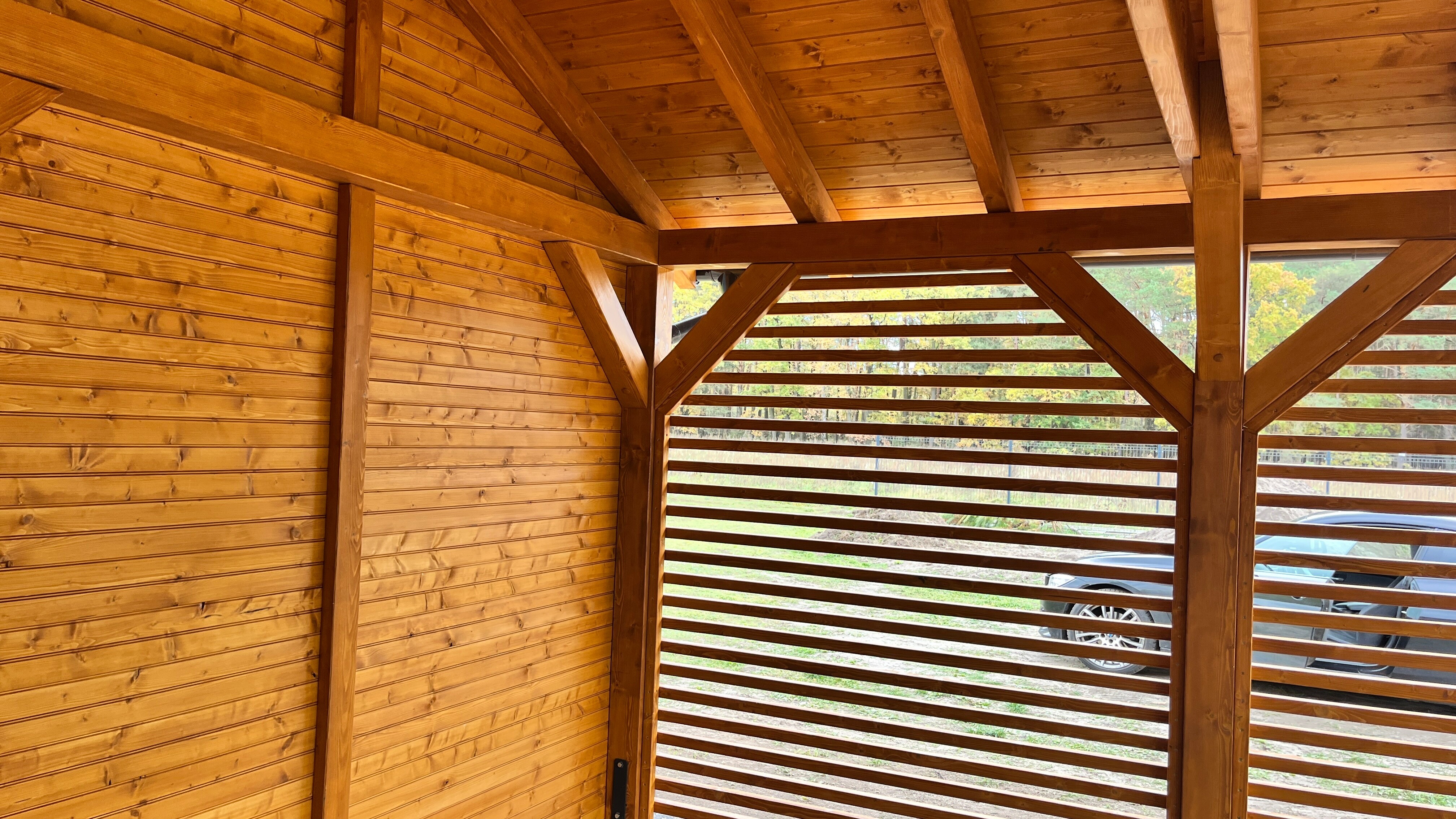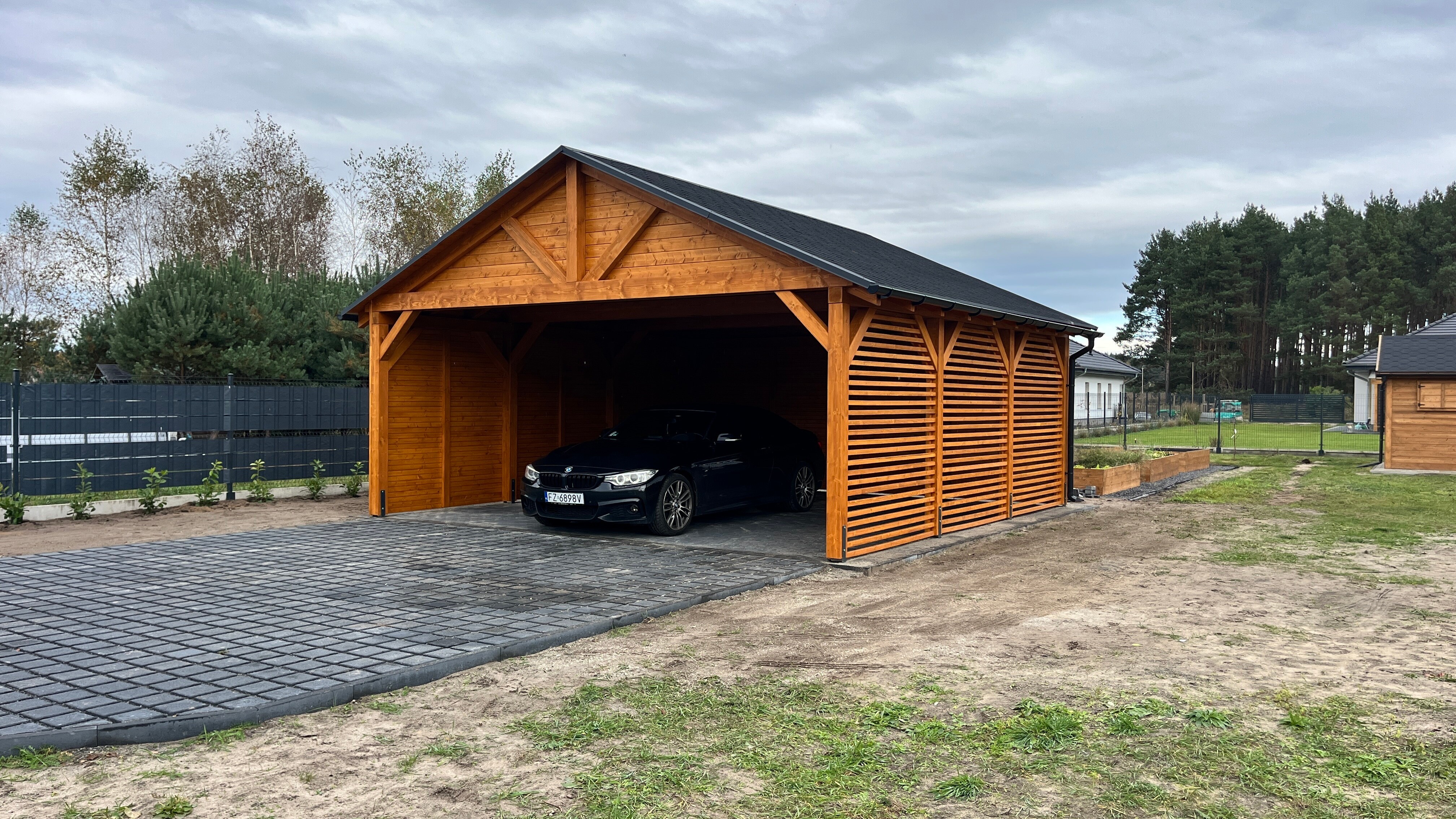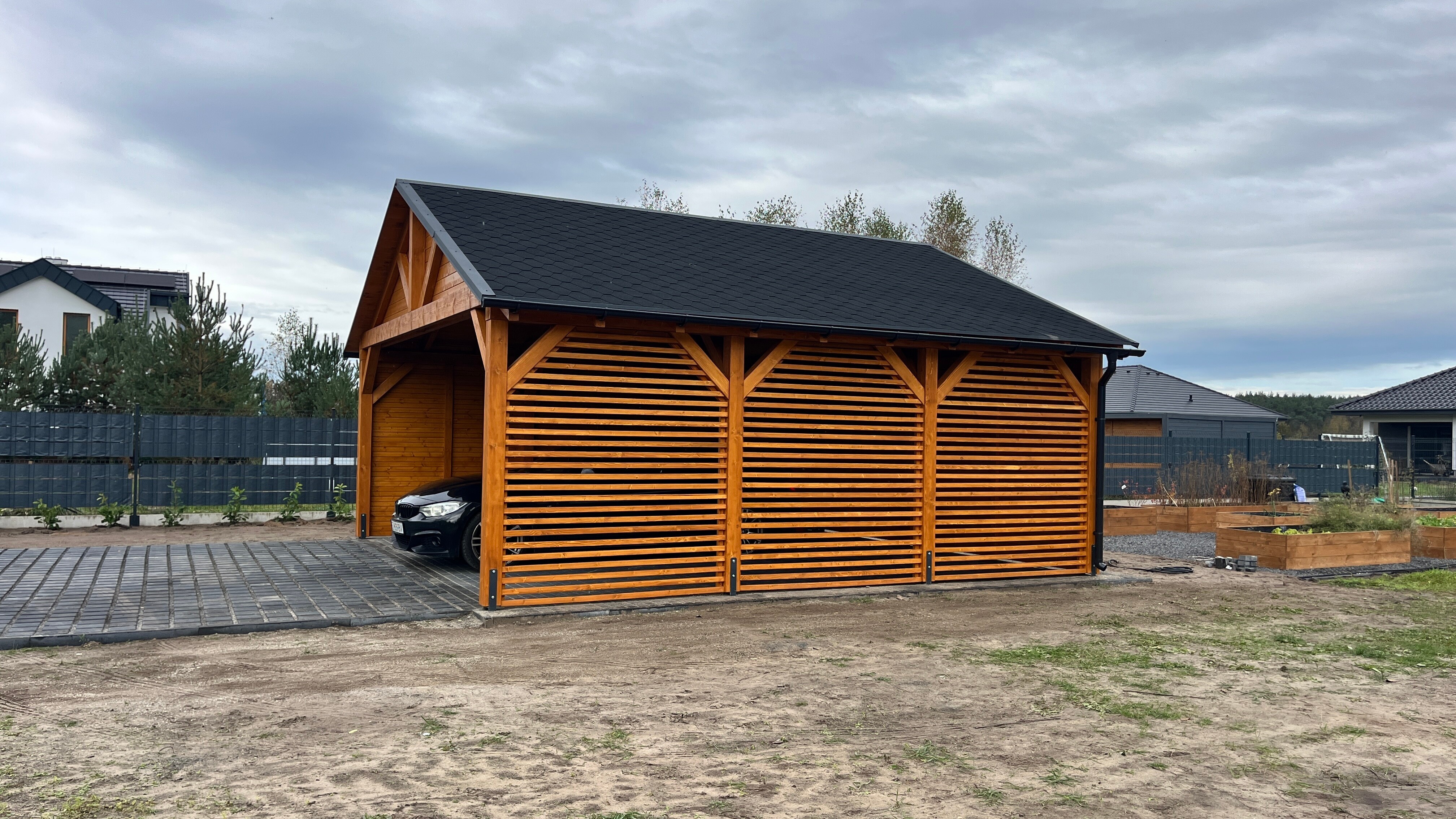 Wiata dwustanowiskowa o wymiarach 6x6,5 m wykonana z drewna KVH. Dach pokryty gontem bitumicznym na pełnym poszyciu z deski. Tył i lewy bok zabudowane na głucho, natomiast prawa strona wykończona drewnianymi lamelami. Całość zaimpregnowana i wykończona lakierobejcą marki Flugger w kolorze Light Amber odporną na warunki atmosferyczne.