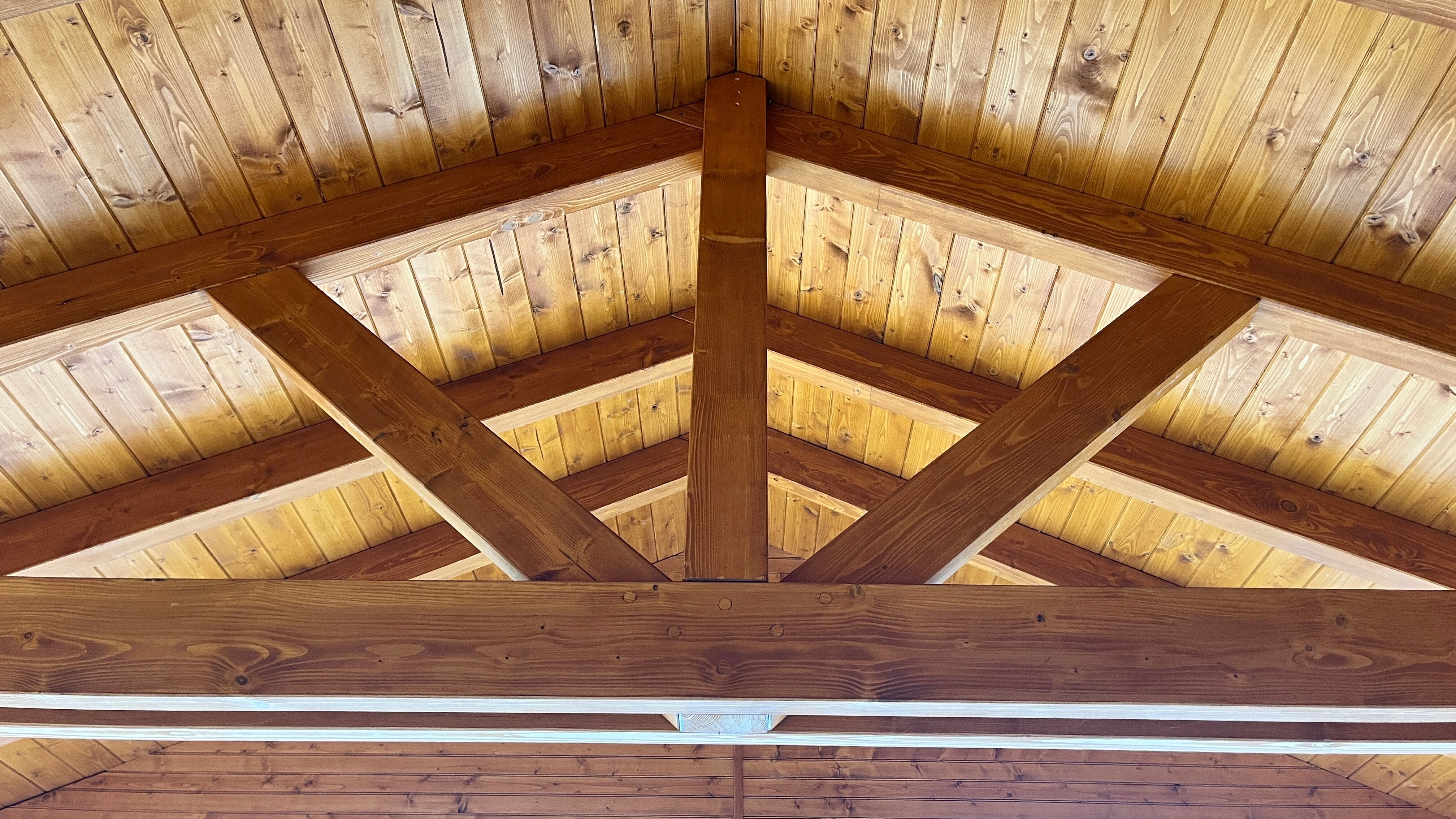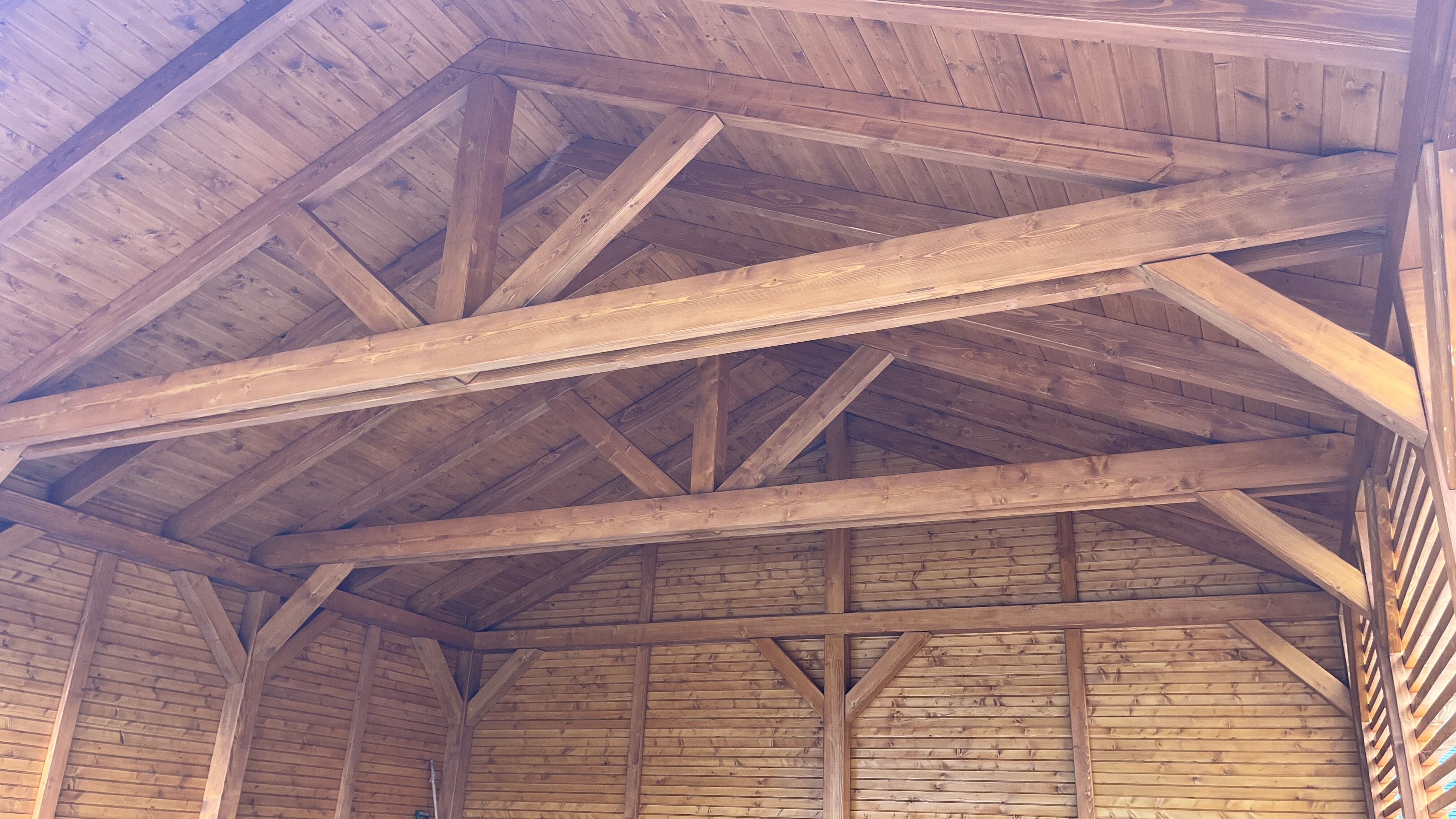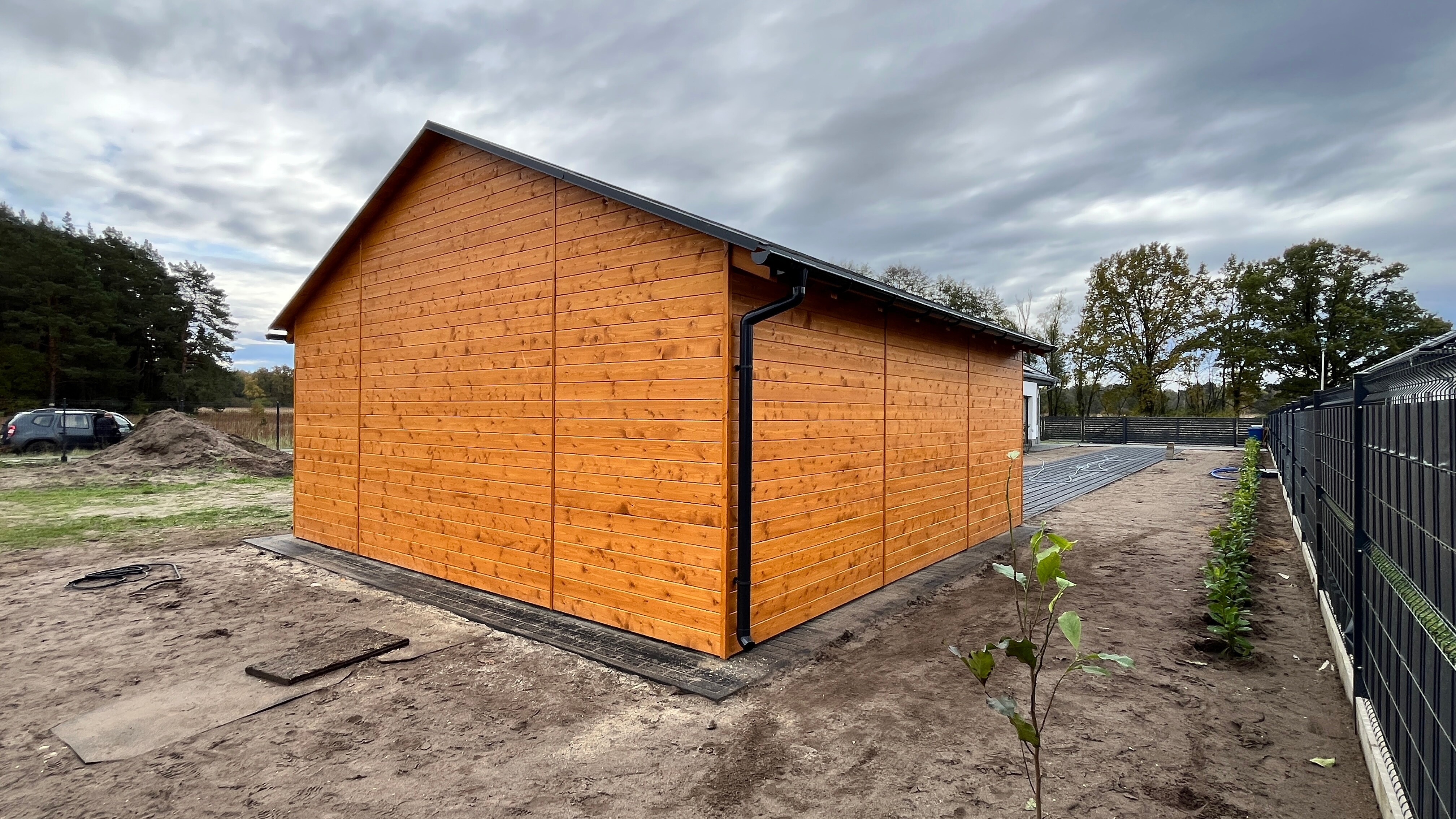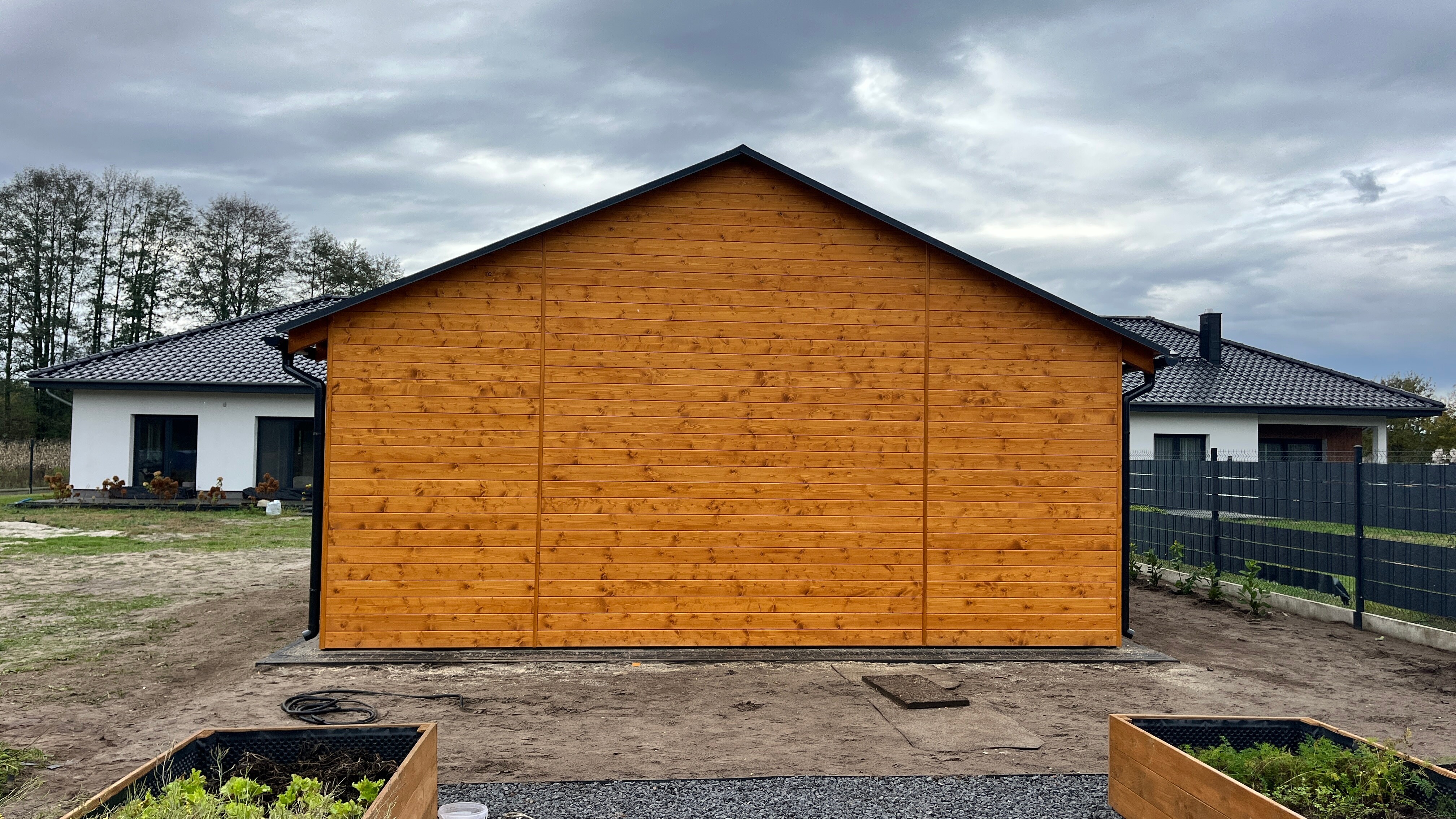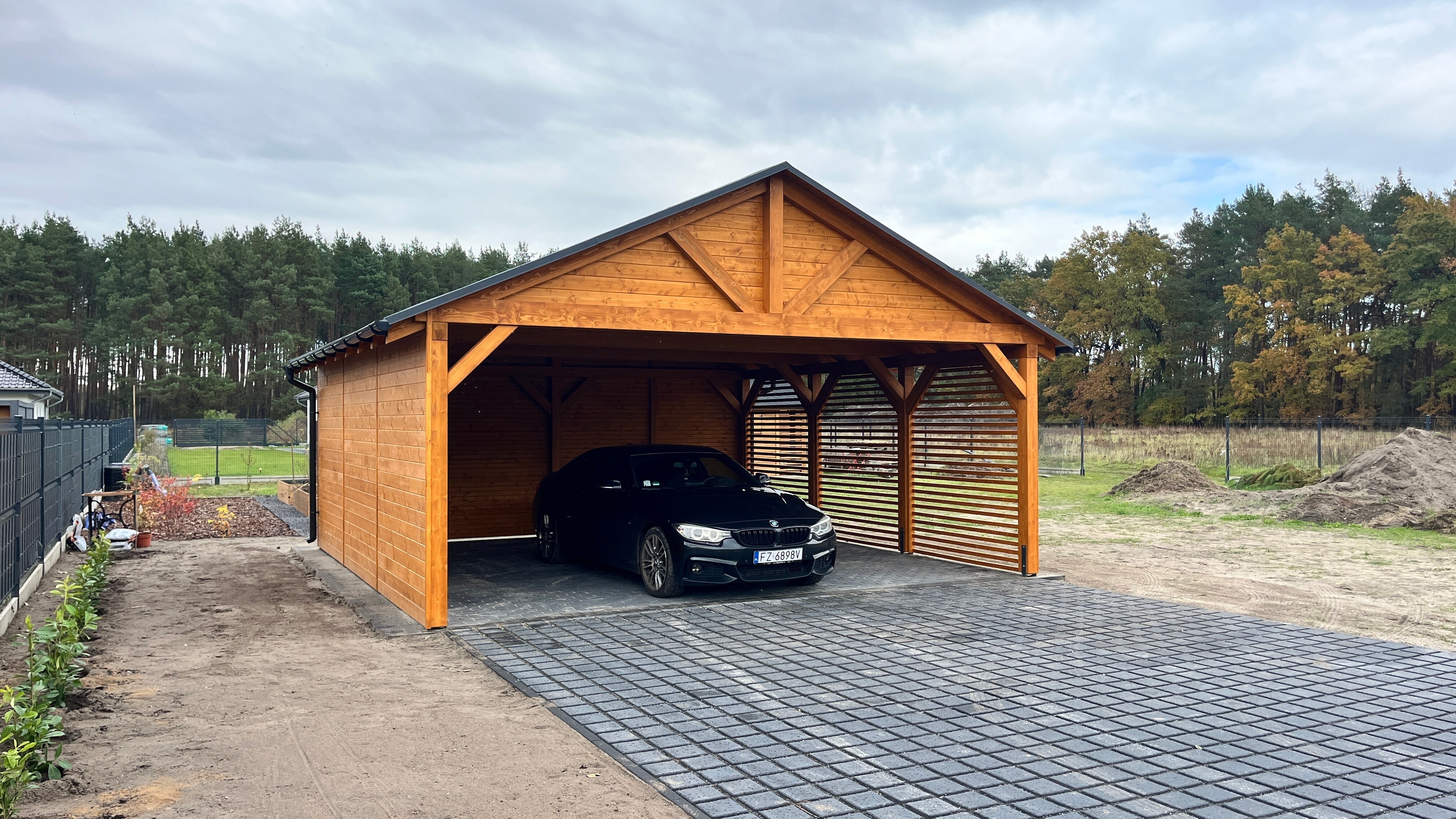 Wiata dwustanowiskowa o wymiarach 6x6,5 m wykonana z drewna KVH. Dach pokryty gontem bitumicznym na pełnym poszyciu z deski. Tył i lewy bok zabudowane na głucho, natomiast prawa strona wykończona drewnianymi lamelami. Całość zaimpregnowana i wykończona lakierobejcą marki Flugger w kolorze Light Amber odporną na warunki atmosferyczne.