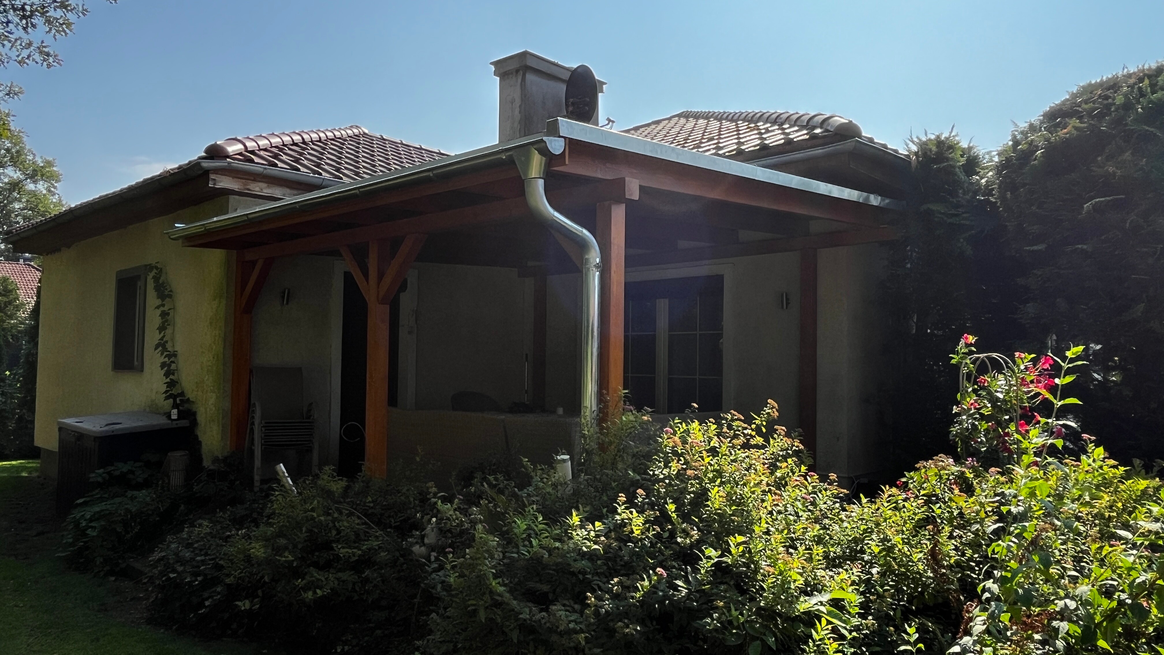 Kolor "light amber" nadaje konstrukcji ciepły, nowoczesny wygląd, który idealnie komponuje się z otoczeniem. Zadaszenie tarasu zostało wykończone podbitką od spodu, co dodatkowo podnosi walory wizualne i chroni konstrukcję przed wpływem wilgoci oraz zmiennych warunków atmosferycznych. Estetyczne wykończenie zadaszenia tarasu sprawia, że całość prezentuje się spójnie i elegancko.